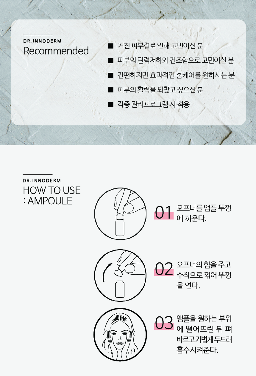 EGF등 6종류의 Multi Growth Factor와 고농도 HA를 함유한 앰플로서 예민하고 민감해진 피부에 도포