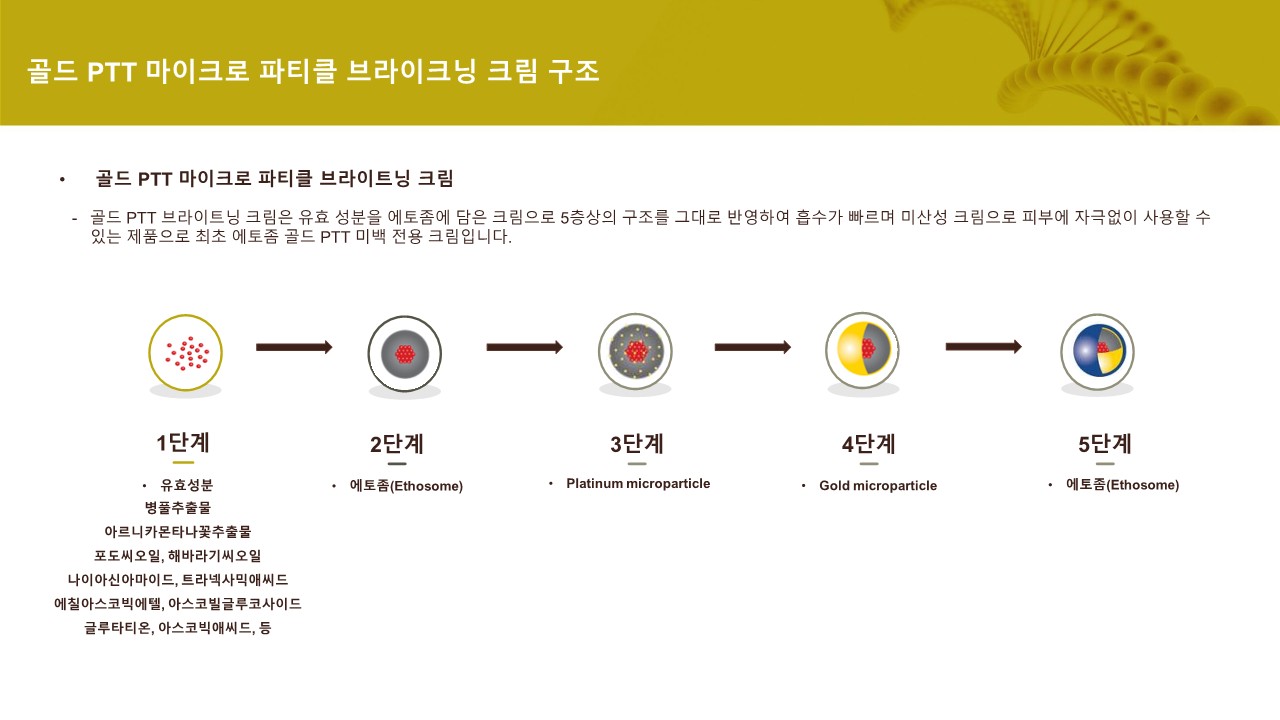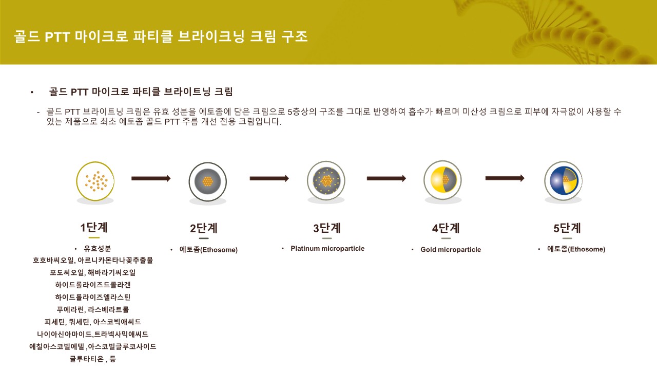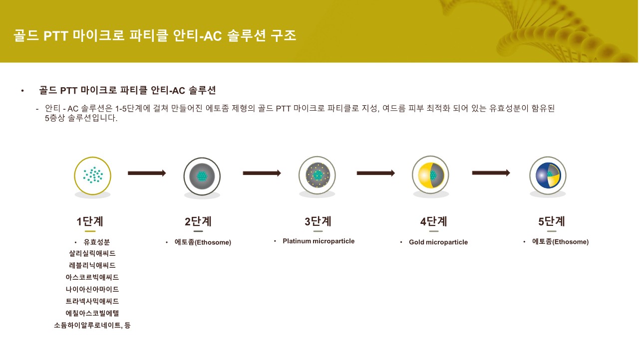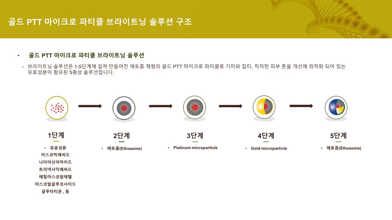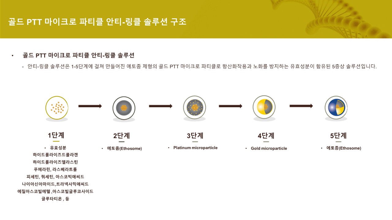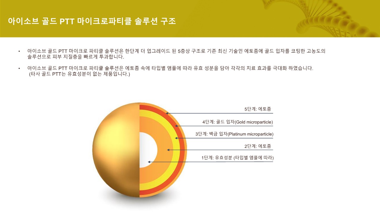 업그레이드 된 5층상 구조로 기존 최신 기술인 에토좀에 골드 입자를 코팅한 고농도의 솔루션으로 피부 지질층을 빠르게 투과