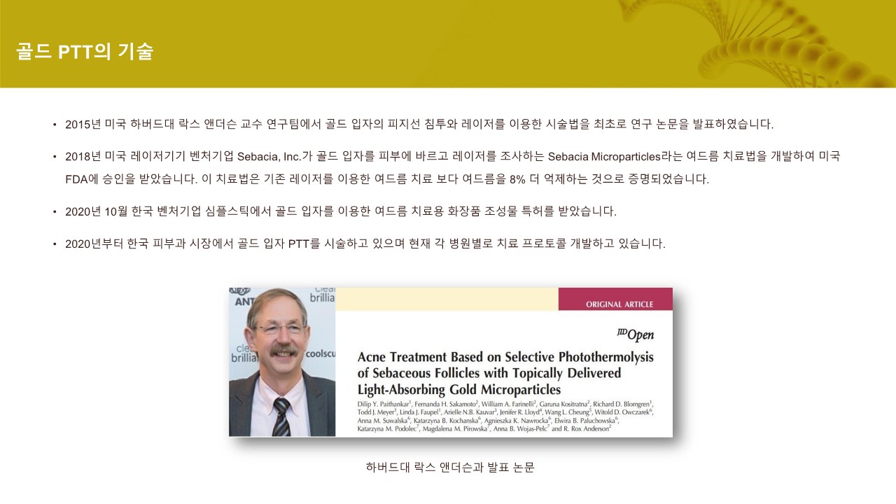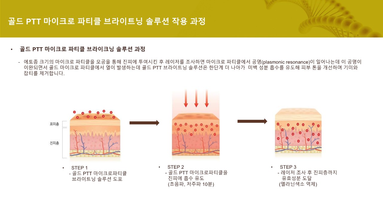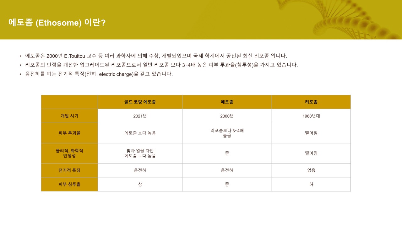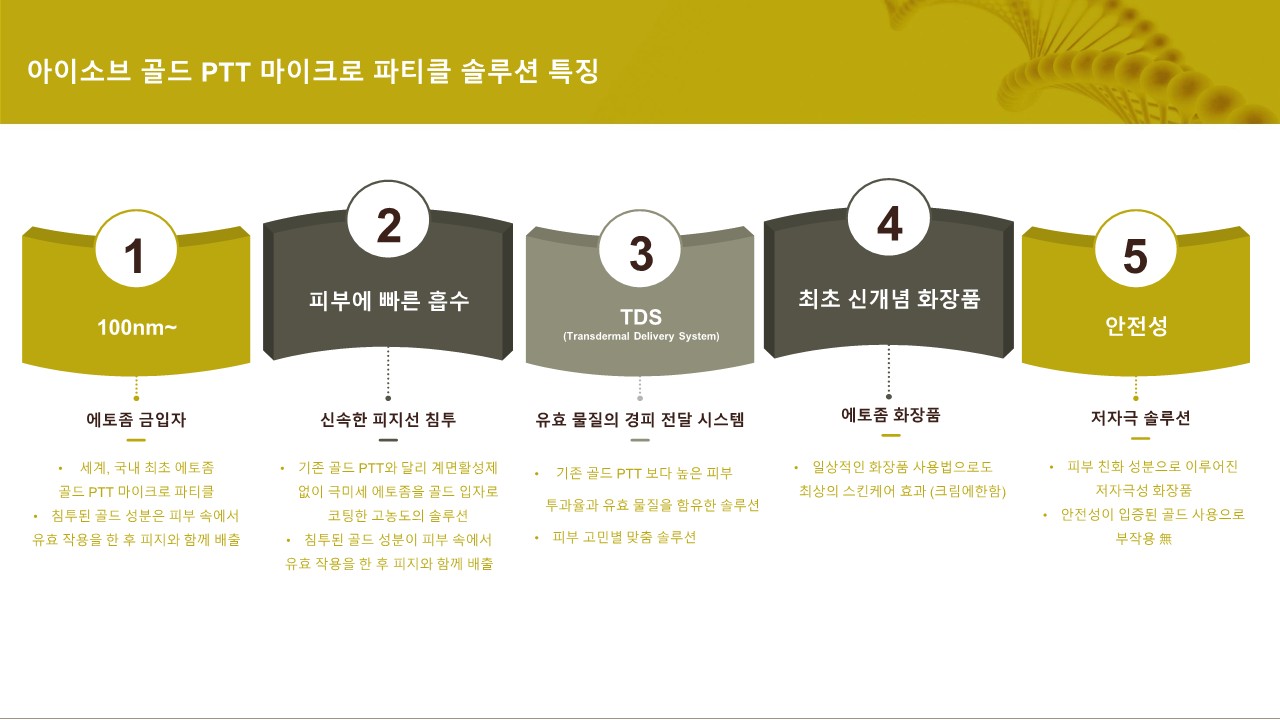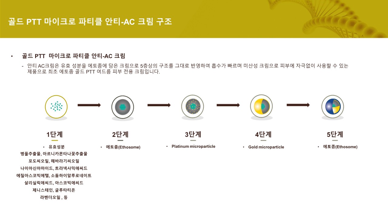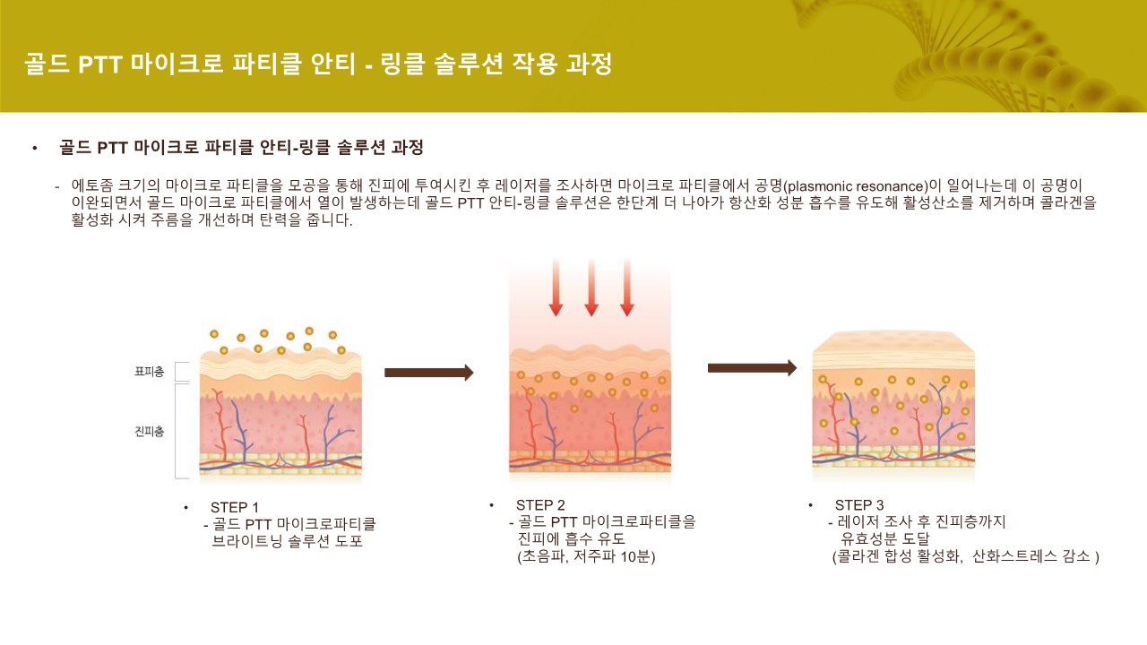 업그레이드 된 5층상 구조로 기존 최신 기술인 에토좀에 골드 입자를 코팅한 고농도의 솔루션으로 피부 지질층을 빠르게 투과
