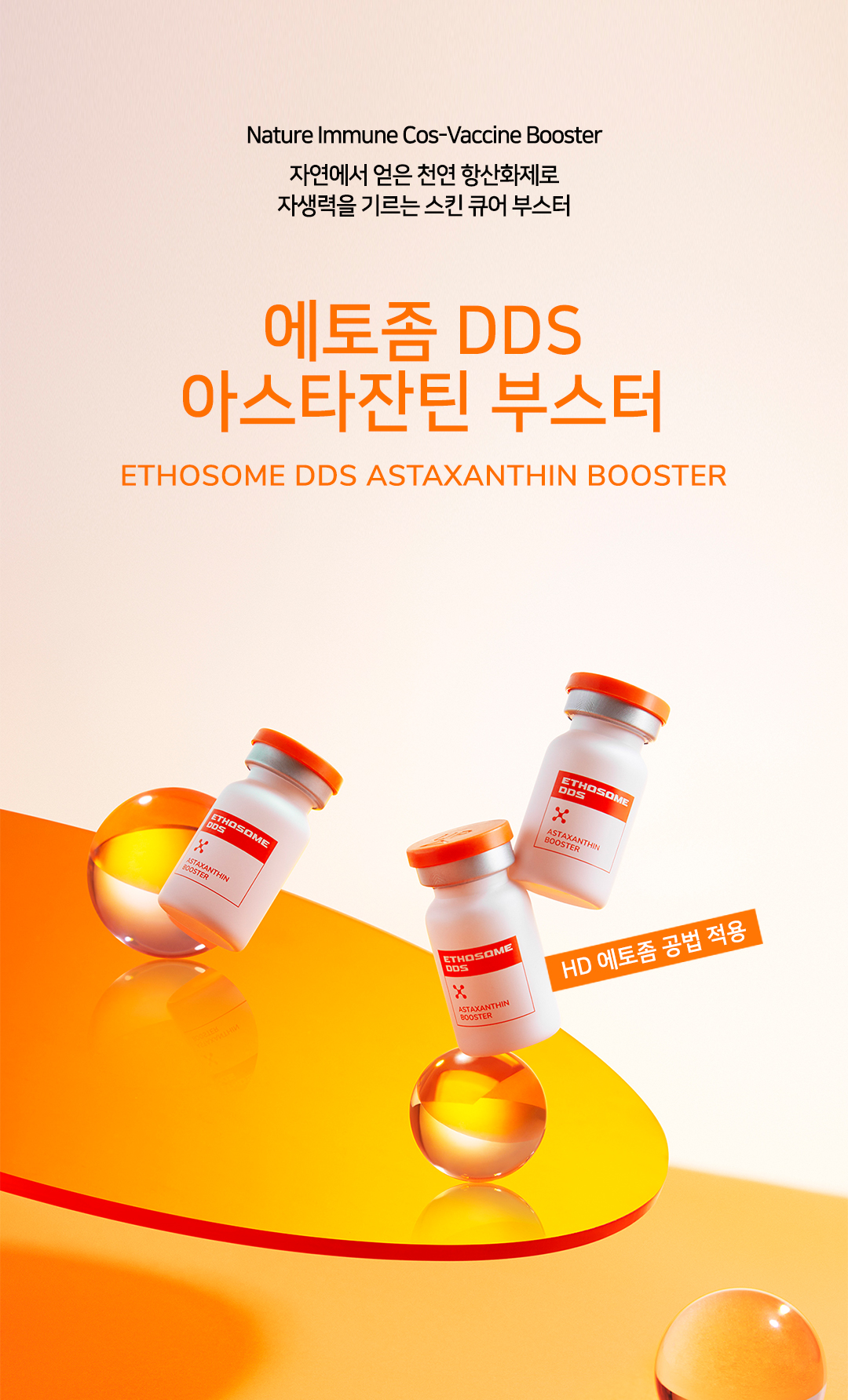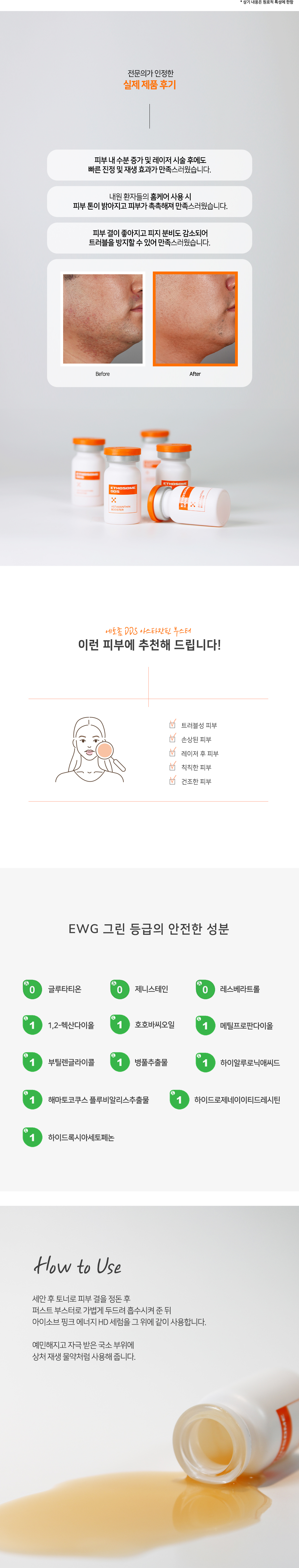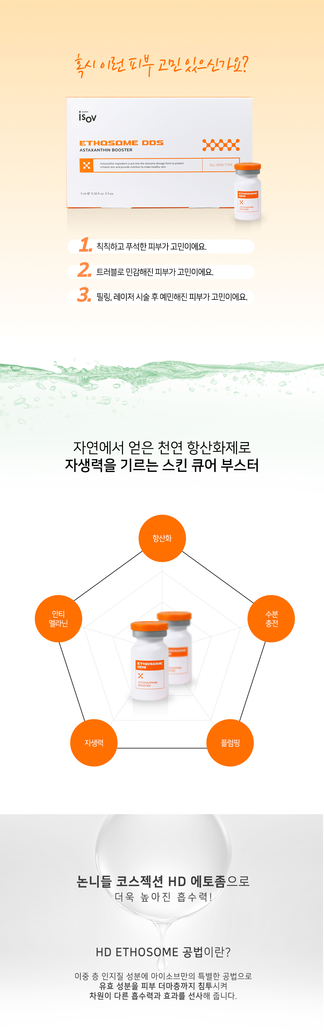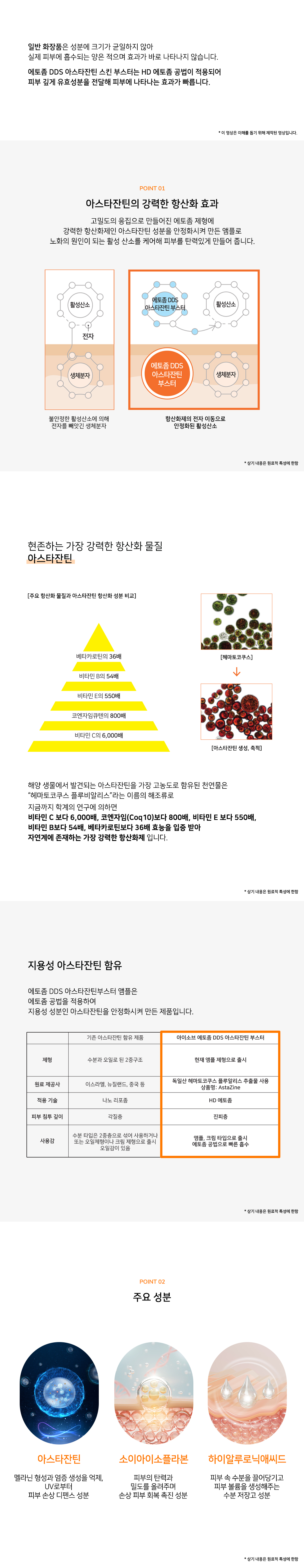 고밀도의 응집으로 만들어진 에토좀 제형에 강력한 항산화제인 아스타잔틴 및 유효 성분을 안정화 시켜 만든 부스터 앰플