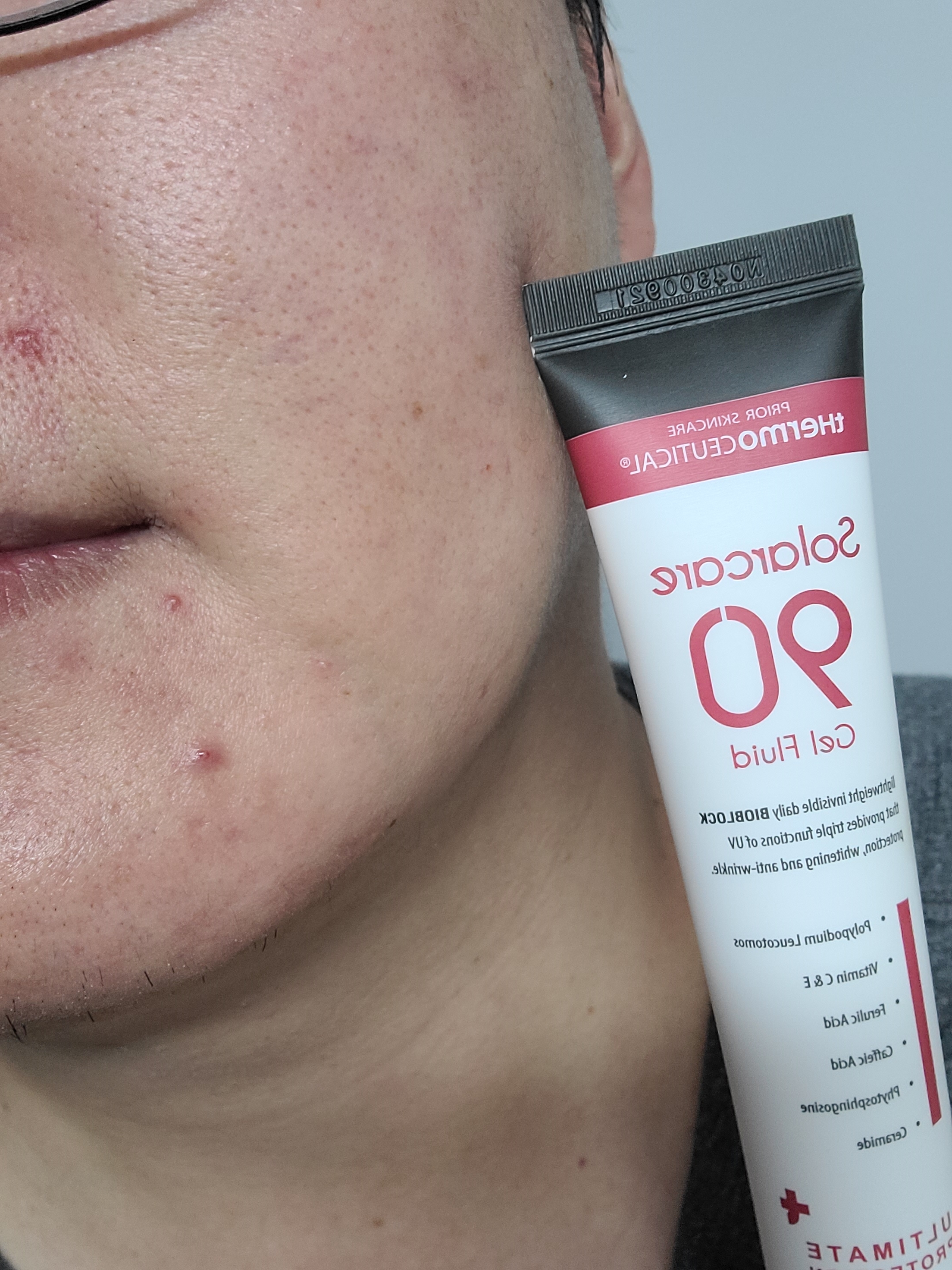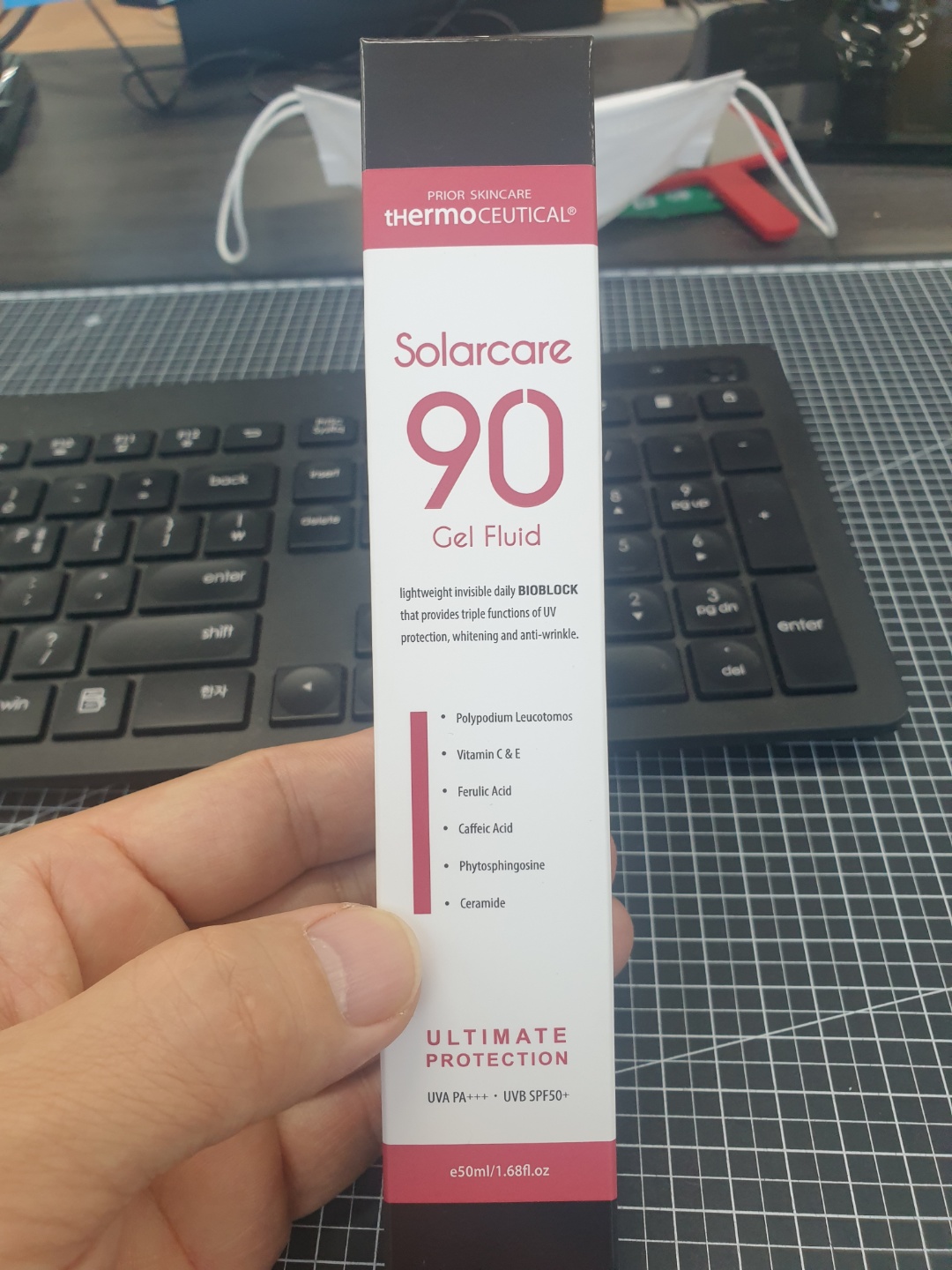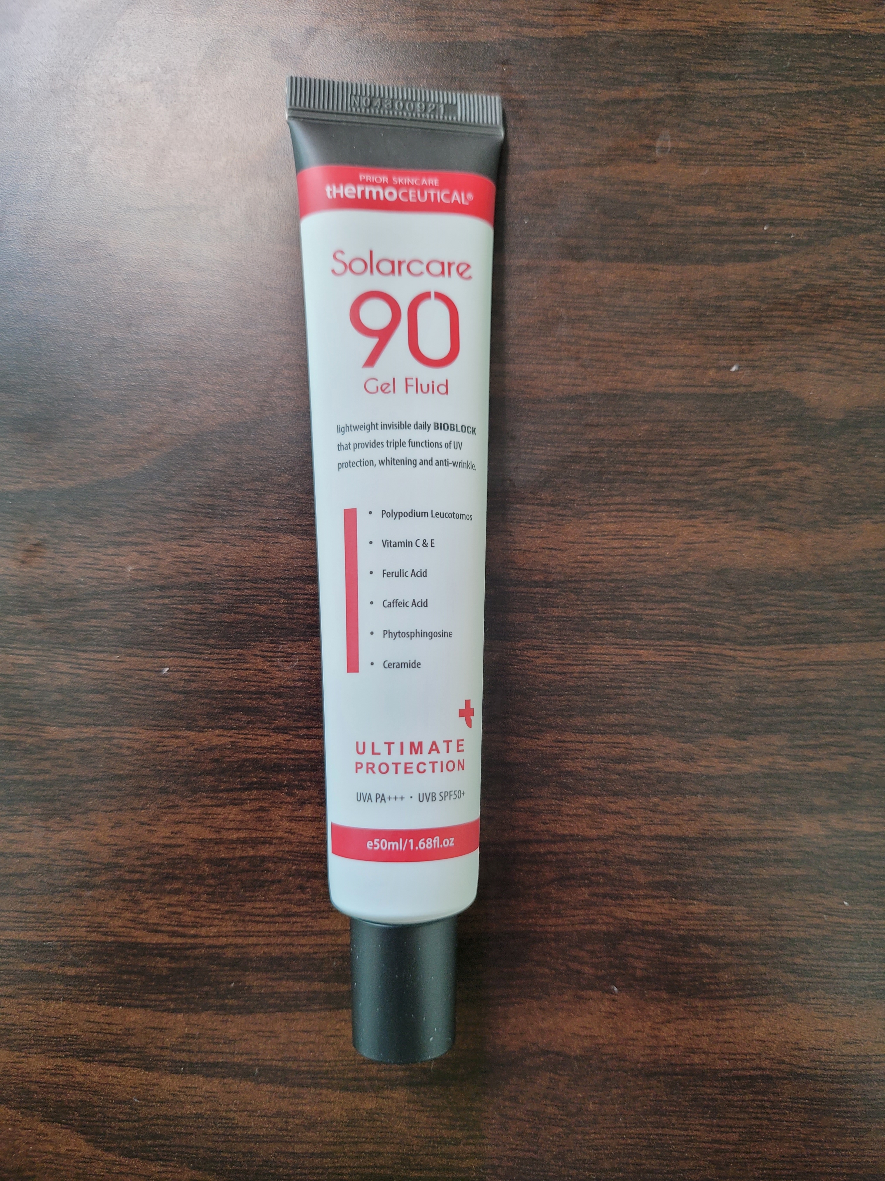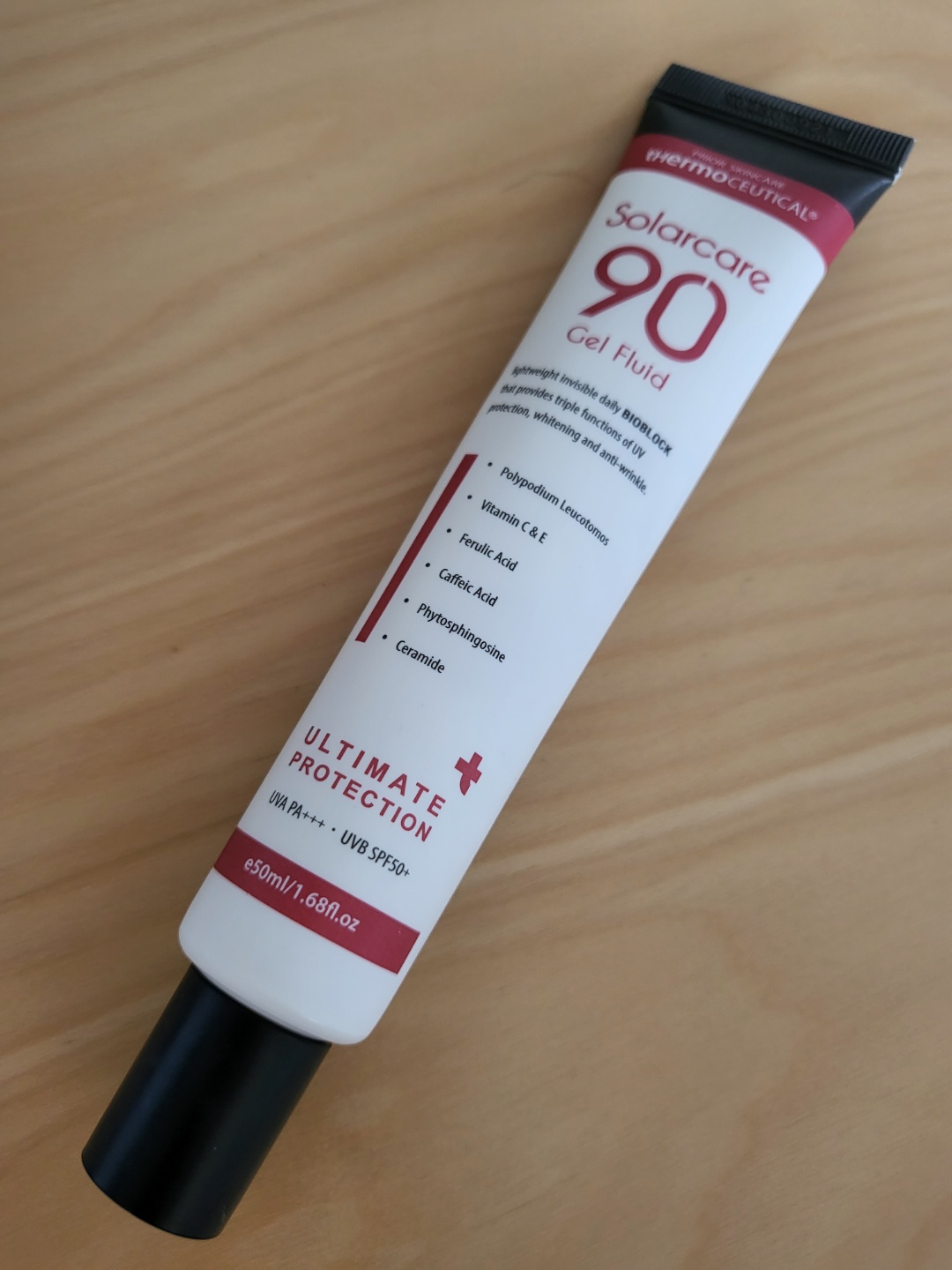 제품 패키징 앞면에 Solarcare 90 gel fluid라고 쓰여있는데 90이라는 숫자가 크게 와닿지가 않습니다. 이 대신에 UVA PA+++, UVB SPF 50+를 더 크게 잘 보이게끔 하는것이 일반 소비자가 보기에 더 와닿지 않을까 하는 생각입니다.