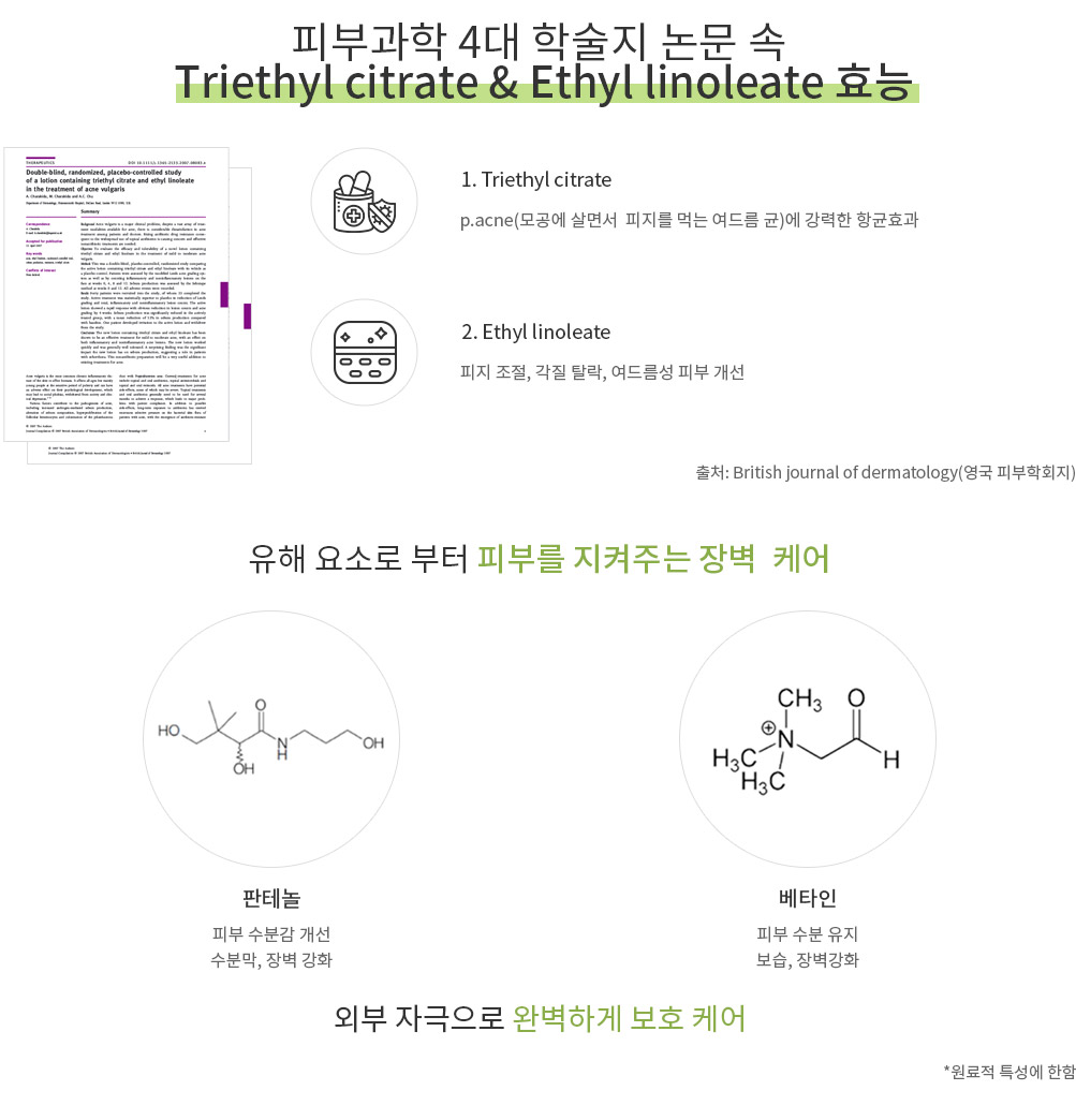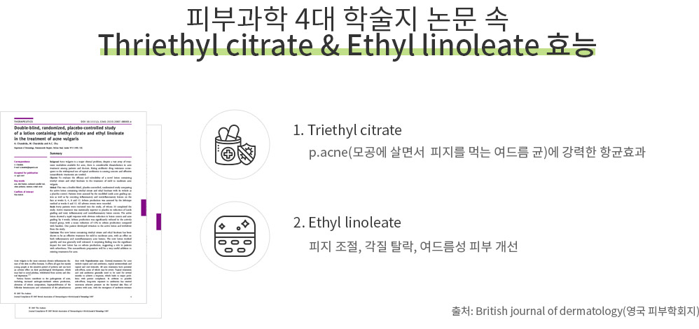 여드름 생성 매커니즘을 완벽 차단하여 여드름 및 지성피부의 정상적인 피지 분비를 꾀하고 P.acne를 억제