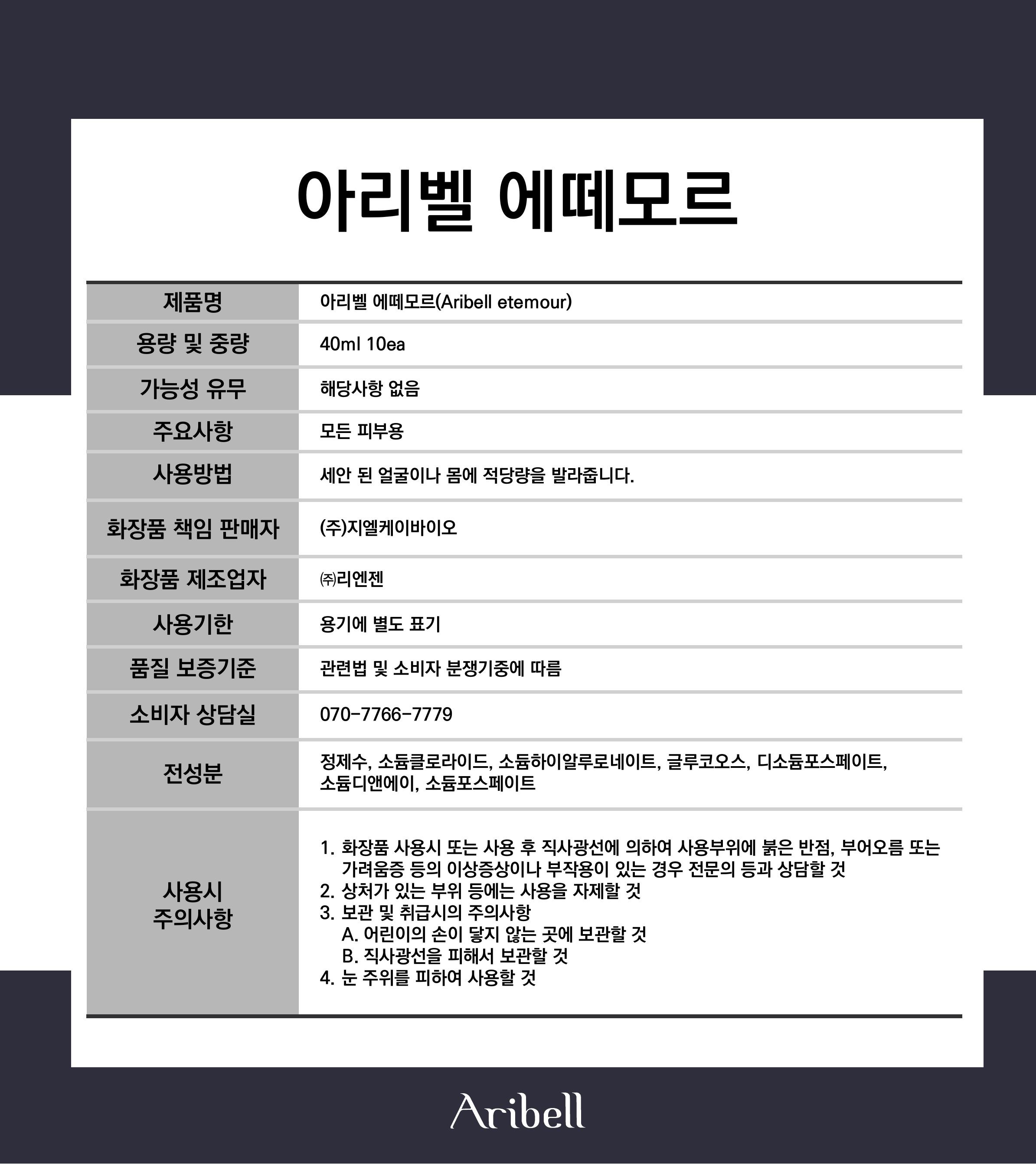 이번에 아리벨 에뜨모르는 수분감에 탄력이 더해진 느낌으로, 업그레이드된 버전이라는 생각이 들었다. 다만 성분표에서 어떤 점이 더 좋아졌는지를 알려 주면 더욱 좋을 것 같다.
